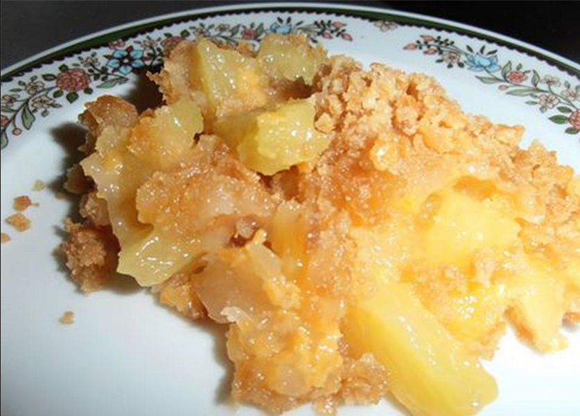 In a bowl, mix the flour and sugar. Stir within the cheese and also the drained pineapple. Stir till all ingredients square measure well combined. Pour into a a pair of quart casserole dish, gently lubricated. mix the nuts, butter and half dozen T. of the reserved juice. touch the highest of the pineapple mixture. Place in a very 350 degree kitchen appliance and bake for 25-30 minutes, or till golden brown on prime.
